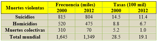 Pero el hecho más notable a nivel mundial, destacado por instituciones como la OPS/OMS y la UNODC, es la reducción de los valores absolutos y relativos de todos los tipos de violencia (las muertes violentas) en el interregno (2000-2012). Este hecho puede ser observado en la Tabla 2.